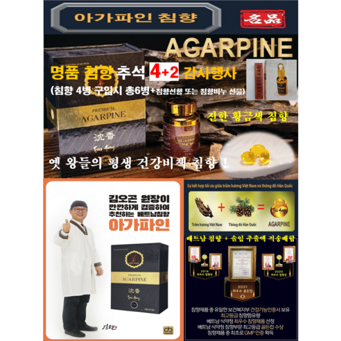 - 4+2 행사: 침향 4병 구매 시 무료 침향 2병 및 침향 선향 세트와 에센스 오일 또는 비누 중 선택 가능한 2종류 패키지 선물