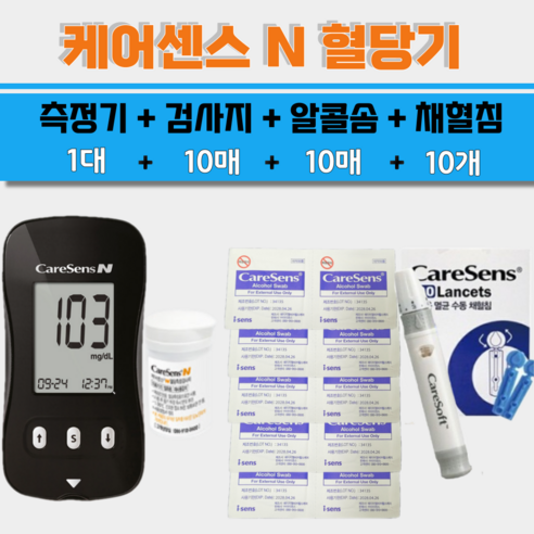 A: 케어센스N 혈당기는 채혈침 10매, 알콜솜 10매, 혈당지 10매가 포함되어 있습니다.
